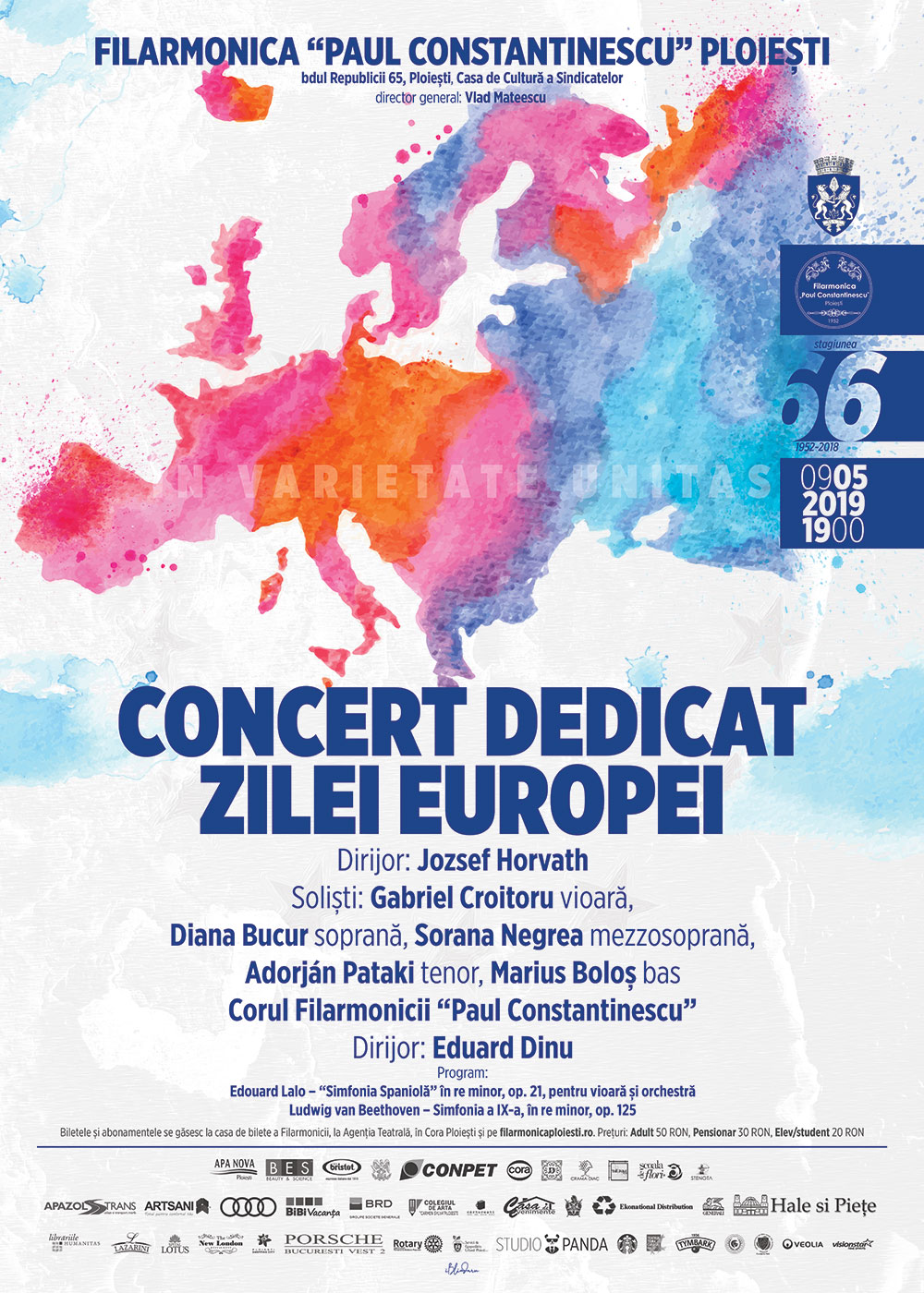 Concert vocal-simfonic extraordinar dedicat Zilei Europei, cu maestrul Jozsef Horvath la pupitrul dirijoral. Soliști sunt violonistul Gabriel Croitoru, soprana Diana Bucur, mezzosoprana Sorana Negrea, tenorul Adorjan Pataki și basul Marius Boloș. Pe scenă va urca și Corul Filarmonicii “Paul Constantinescu” – dirijor Eduard Dinu. Programul este compus din ”Simfonia Spaniolă” în re minor, op. 21, pentru vioară și orchestră a lui Edouard Lalo și Simfonia a IX-a, în re minor, op. 125, de Ludwig van Beethoven. Evenimentul, care are loc pe data de 9 mai 2019 la Casa Sindicatelor, este programat să înceapă la ora 19.00.