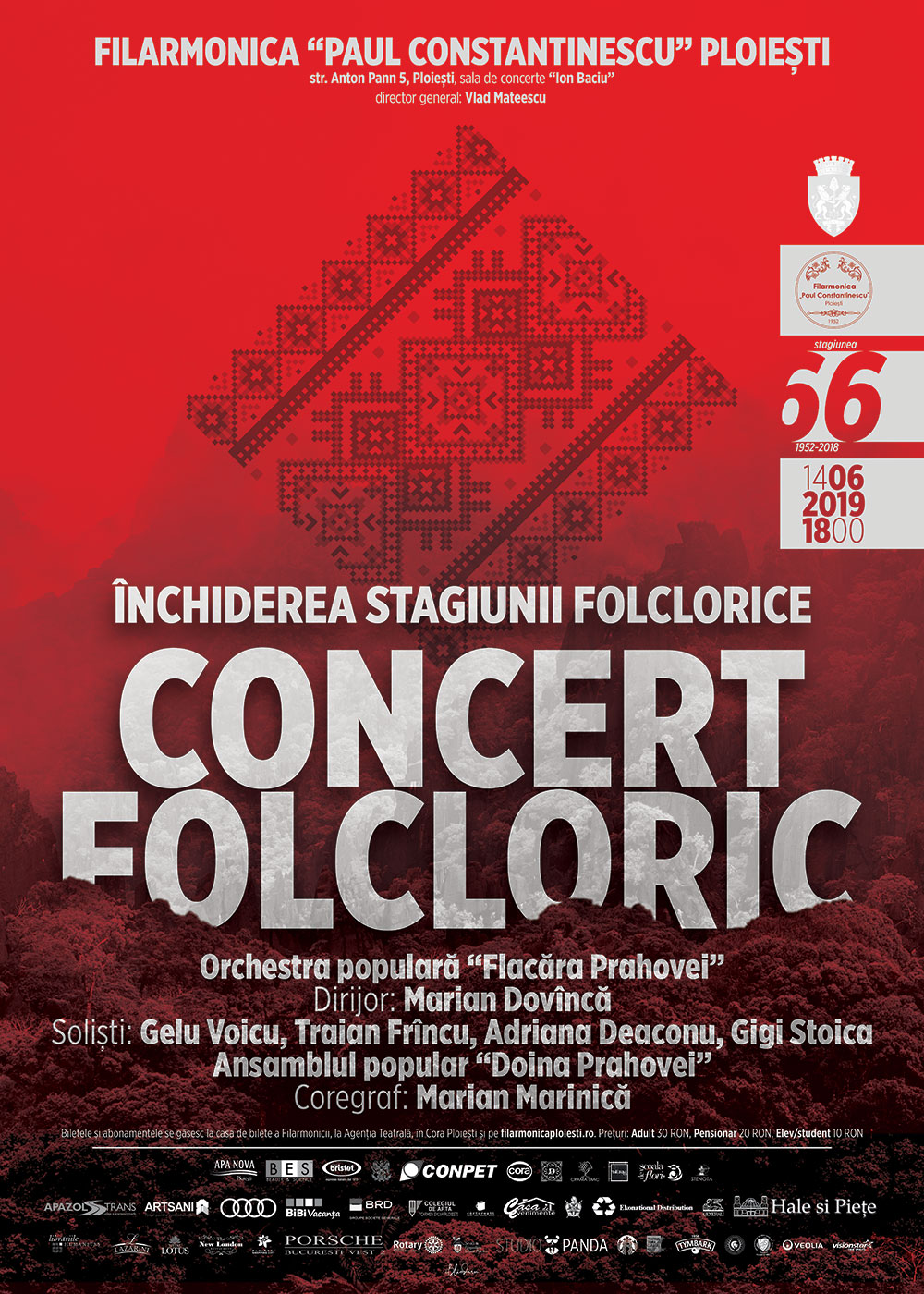 Orchestra Populară „Flacăra Prahovei”, condusă de dirijorul Marian Dovîncă, încheie stagiunea 2018-2019 cu un concert care-i va aduce în fața publicului pe talentații soliști Gelu Voicu, Traian Frîncu, Adriana Deaconu și Gigi Stoica. Invitați sunt membrii Ansamblului „Doina Prahovei” – coregraf Marian Marinică. Vă așteptăm vineri, 14 iunie 2019, de la ora 18.00, în Sala „Ion Baciu” a Filarmonicii.
