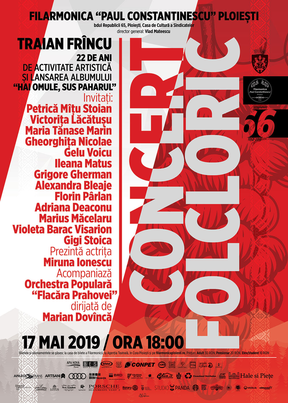 Solist vocal al orchestrei populare „Flacăra Prahovei”, Traian Frîncu aniversează în această lună 22 de ani de activitate artistică, iar cu această ocazie va lansa și ultimul său album, „Hai omule, sus paharul”. Vă așteptăm vineri, 17 mai, de la ora 18.00, să vă bucurați de câteva ore de voie bună în compania lui Traian Frîncu și a invitaților săi: Petrică Mîțu Stoian, Victorița Lăcătușu, Maria Tănase Marin, Gheorghița Nicolae, Gelu Voicu, Ileana Matus, Grigore Gherman, Alexandra Bleaje, Florin Pârlan, Adriana Deaconu, Marius Măcelaru, Violeta Barac Visarion și Gigi Stoica. Prezintă actrița Miruna Ionescu. Acompaniază orchestra populară „Flacăra Prahovei”, dirijată de Marian Dovîncă. Concertul va avea loc pe scena Casei de Cultură a Sindicatelor.