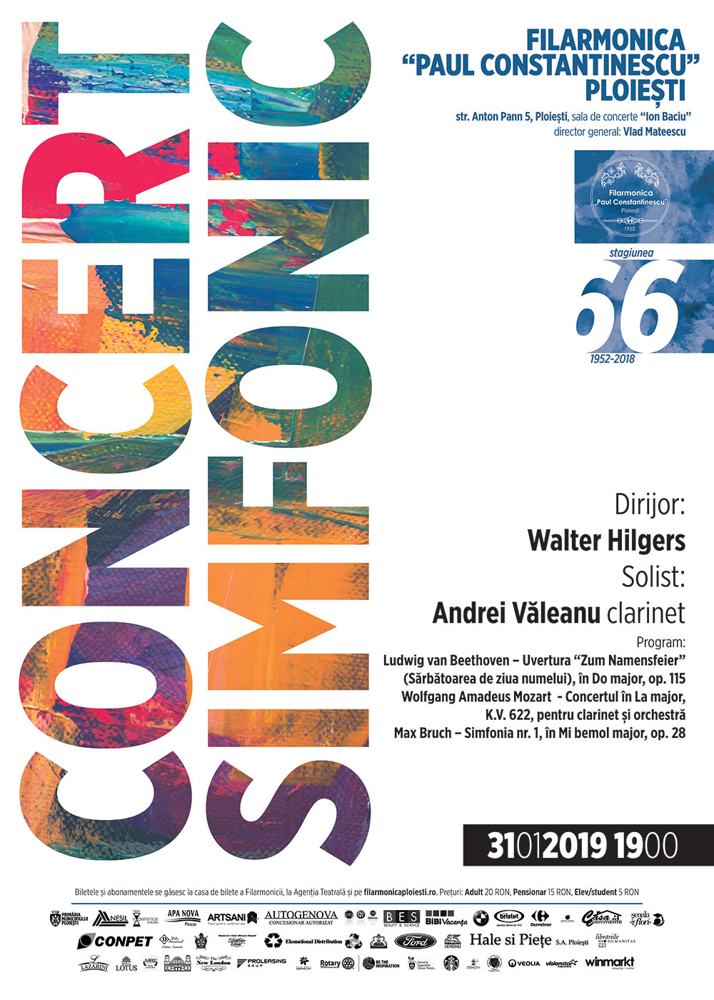 Uvertura „Zum Namensfeier” (Sărbătoarea de ziua numelui), în Do major, op. 115 de Ludwig van Beethoven deschide ultimul concert al lunii ianuarie, de la Filarmonică. Aflată sub bagheta dirijorală a maestrului Walter Hilgers, orchestra simfonică îl va avea invitat pe clarinetisul Andrei Văleanu. Programul serii mai cuprinde Concertul în La major, K.V. 622, pentru clarinet și orchestră de Wolfgang Amadeus Mozart şi Simfonia nr. 1, în Mi bemol major, op. 28.