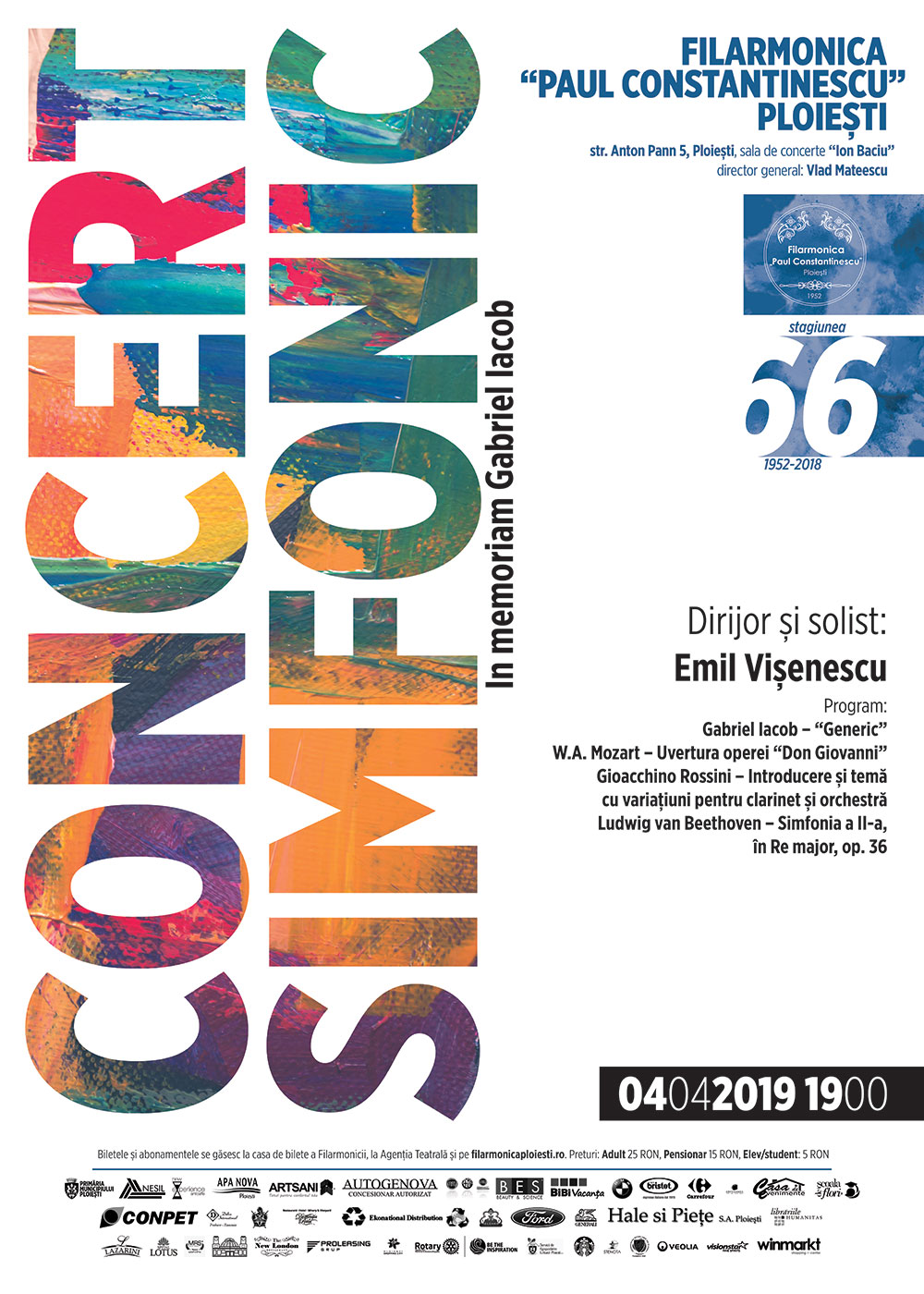 Gabriel Iacob – „Generic”, Wolfgang Amadeus Mozart – Uvertura operei „Don Giovanni”, Gioacchino Rossini – Introducere şi temă cu variaţiuni pentru clarinet şi orchestră și Ludwig van Beethoven –Simfonia a II-a, în Re major, op. 36 compun pogramul serii de joi, 4 aprilie 2019, de la Filarmonică. Invitatul orchestrei simfonice este Emil Vișenescu, venit la Ploiești de această dată în dublă calitate: dirijor și solist.