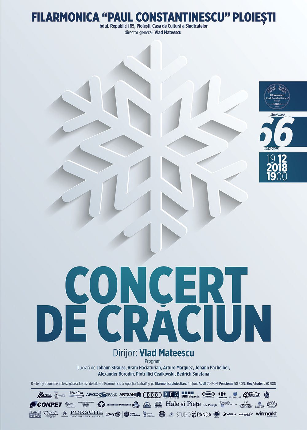 Filarmonica “Paul Constantinescu” organizează miercuri, 19 decembrie 2018, de la ora 19.00, la Casa de Cultură a Sindicatelor, tradiționalul Concert de Crăciun. Orchestra simfonică, aflată sub bagheta dirijorului Vlad Mateescu, v-a pregătit lucrări de Johann Strauss, Aram Haciaturian, Arturo Márquez, Johann Pachelbel, Alexandr Borodin, Piotr Ilici Ceaikovski și Bedřich Smetana.