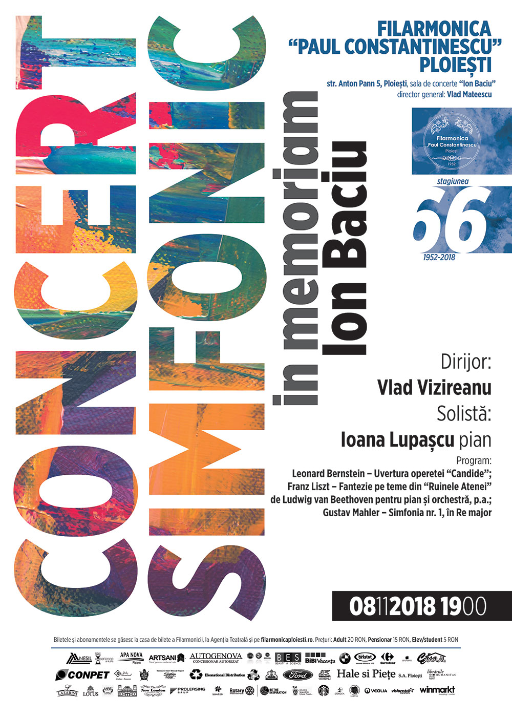 Filarmonica Paul Constantinescu cinstește memoria maestrului Ion Baciu, dirijor al Orchestrei Simfonice ploieștene între anii 1955 și 1962. La pupitrul dirijoral se va afla Vlad Vizireanu, solistă a serii fiind pianista Ioana Maria Lupașcu. Veți putea audia lucrări semnate Leonard Bernstein – Uvertura operetei „Candide”, Franz Liszt – Fantezia pe teme din „Ruinele Atenei” de Ludwig van Beethoven, pentru pian și orchestră și Gustav Mahler – Simfonia nr. 1 în Re Major.