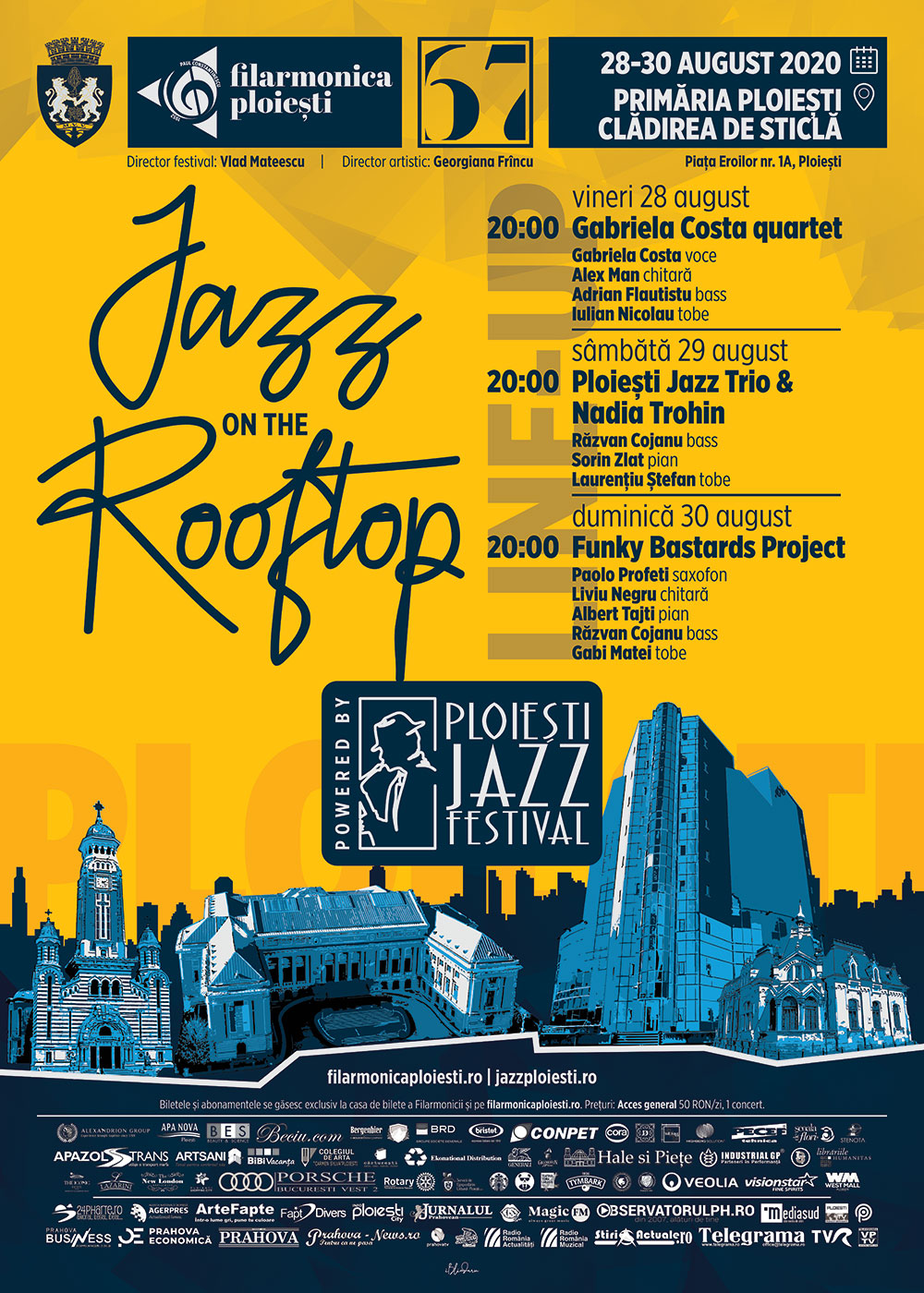 Jazz on the Rooftop – ediția a treia! Vă așteptăm, între 28 și 30 august 2020, să petrecem împreună trei seri de neuitat într-o atmosferă extraordinară. Unele dintre cele mai apreciate trupe de jazz vă dau întâlnire pe terasa clădirii de sticlă în care funcționează Primăria Ploiești (fostul sediu al OMV Petrom).