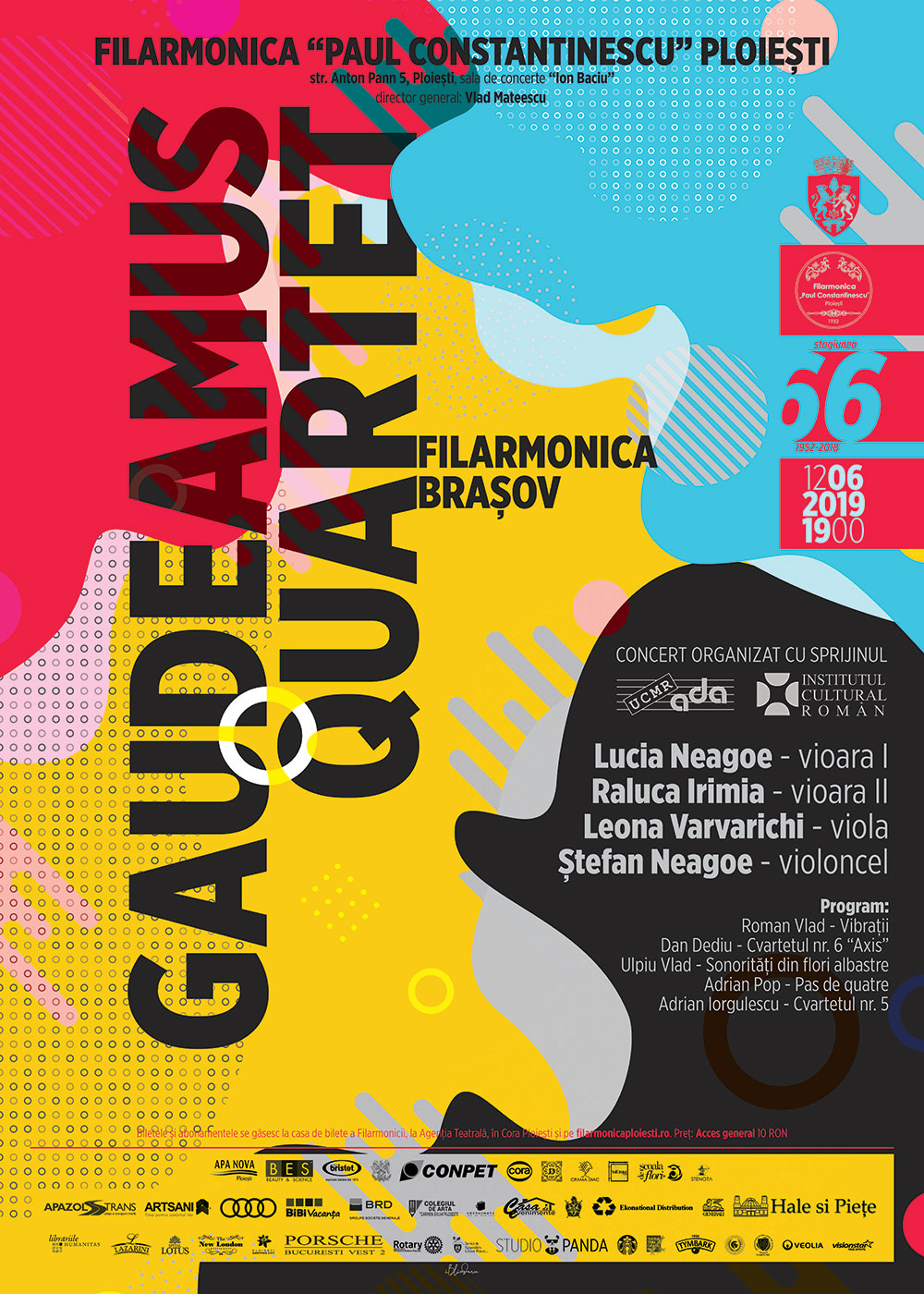 Quartet-ul brașovean Gaudeamus concertează la Filarmonica “Paul Constantinescu” din Ploiești pe 12 iunie 2019, de la ora 19.00. Lucia Neagoe (vioara I), Raluca Irimia (vioara a II-a), Leona Varvarichi (violă) și Ștefan Neagoe (violoncel) pregătesc pentru melomanii prahoveni “Vibrații“, de Roman Vlad, Cvartetul nr 6 “Axis”, de Dan Dediu, “Sonorități din flori albastre” de Ulpiu Vlad, “Pas de quatre”, de Adrian Pop și Cvartetul nr. 5, de Adrian Iorgulescu. Concertul este organizat cu sprijinul Institutului Cultural Român și UCMR –ADA.